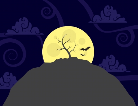 大きい月の前に丘の上にローンツリーのイラスト素材 ベクタ Image
